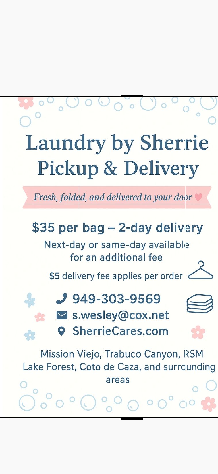 Welcome to Sherrie Cares, I would also love to help you with laundry. I love to pick up and deliver laundry in my area.🌸
